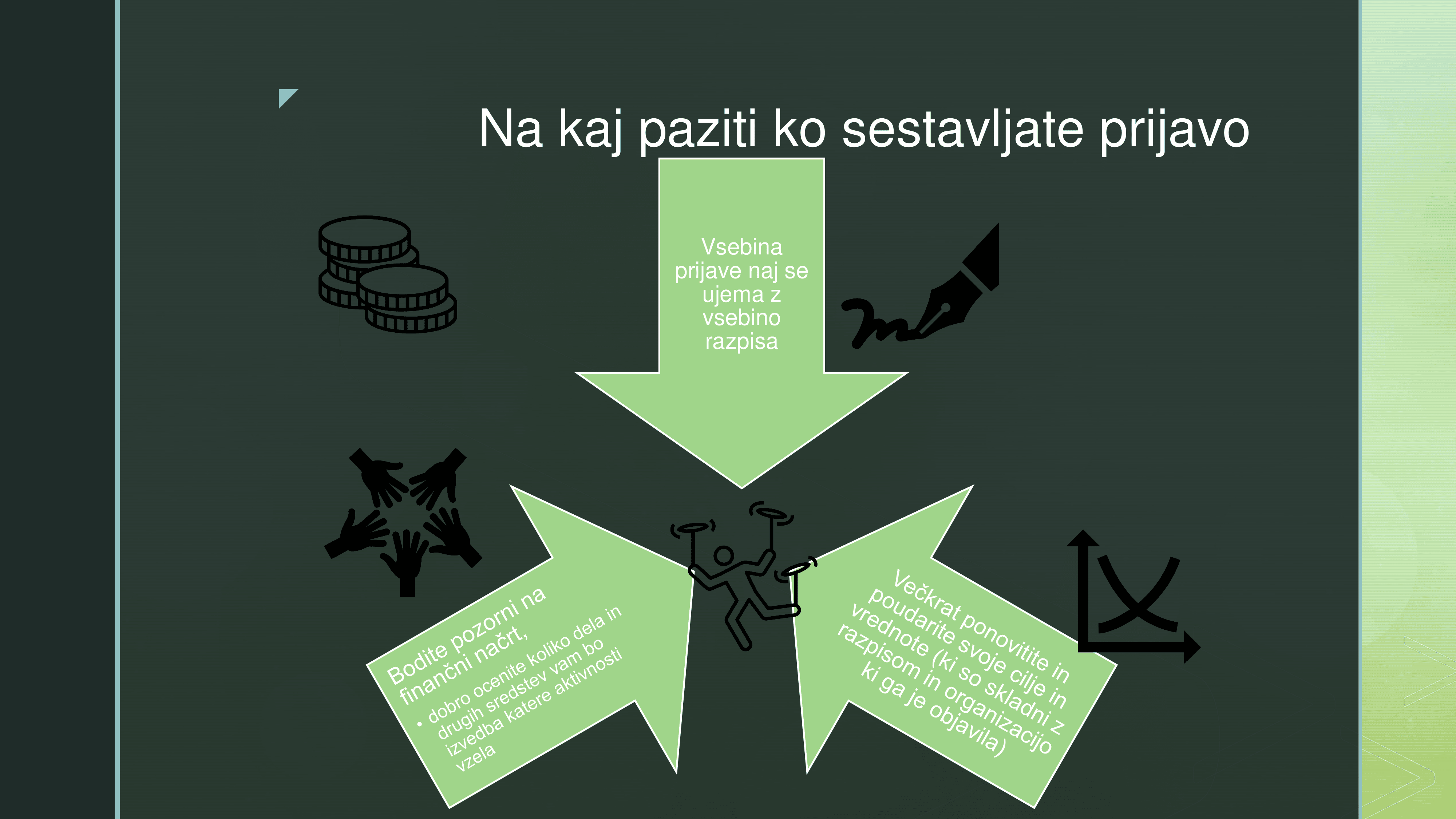 Udeležence je skozi tematiko vodila Nataša Novak, strokovnjakinja za odnose z javnostmi in projektno vodenje v nevladnem sektorju. Poudarek predavanja je bil na prepoznavanju priložnosti za financiranje, pravilnem pristopu k pisanju projektnih prijav ter učinkovitem komuniciranju projektnih ciljev različnim javnostim.