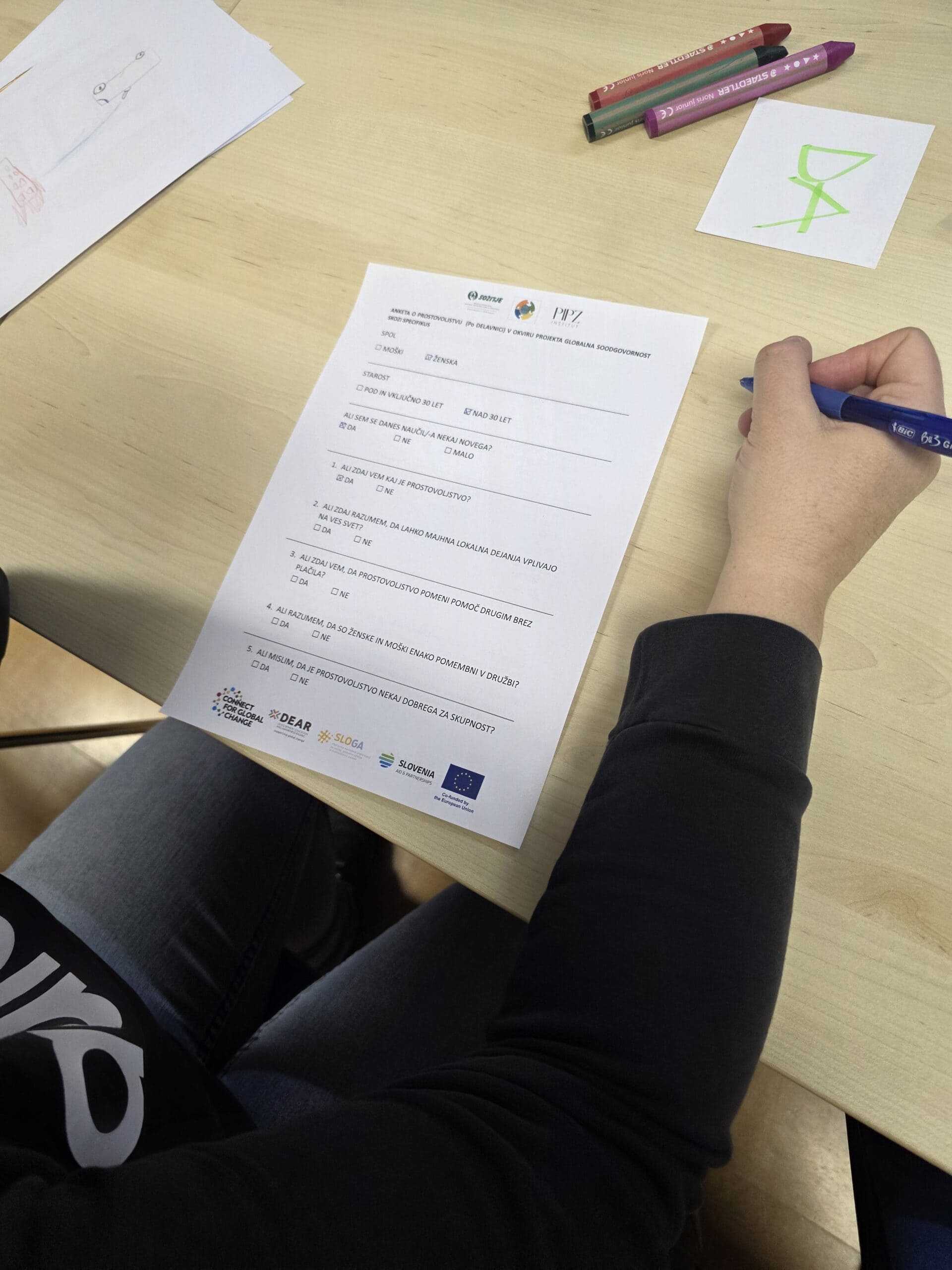 Zaključek delavnice je bil ustvarjalen. Vsak izmed prisotnih je skozi risbo upodobil svojo predstavo koncepta prostovoljstva. Nastale so raznolike podobe pomoči, sodelovanja, solidarnosti in povezovanja, ki so pokazale, kako različno, a hkrati podobno udeleženci in udeleženke doživljajo prostovoljsko delo.