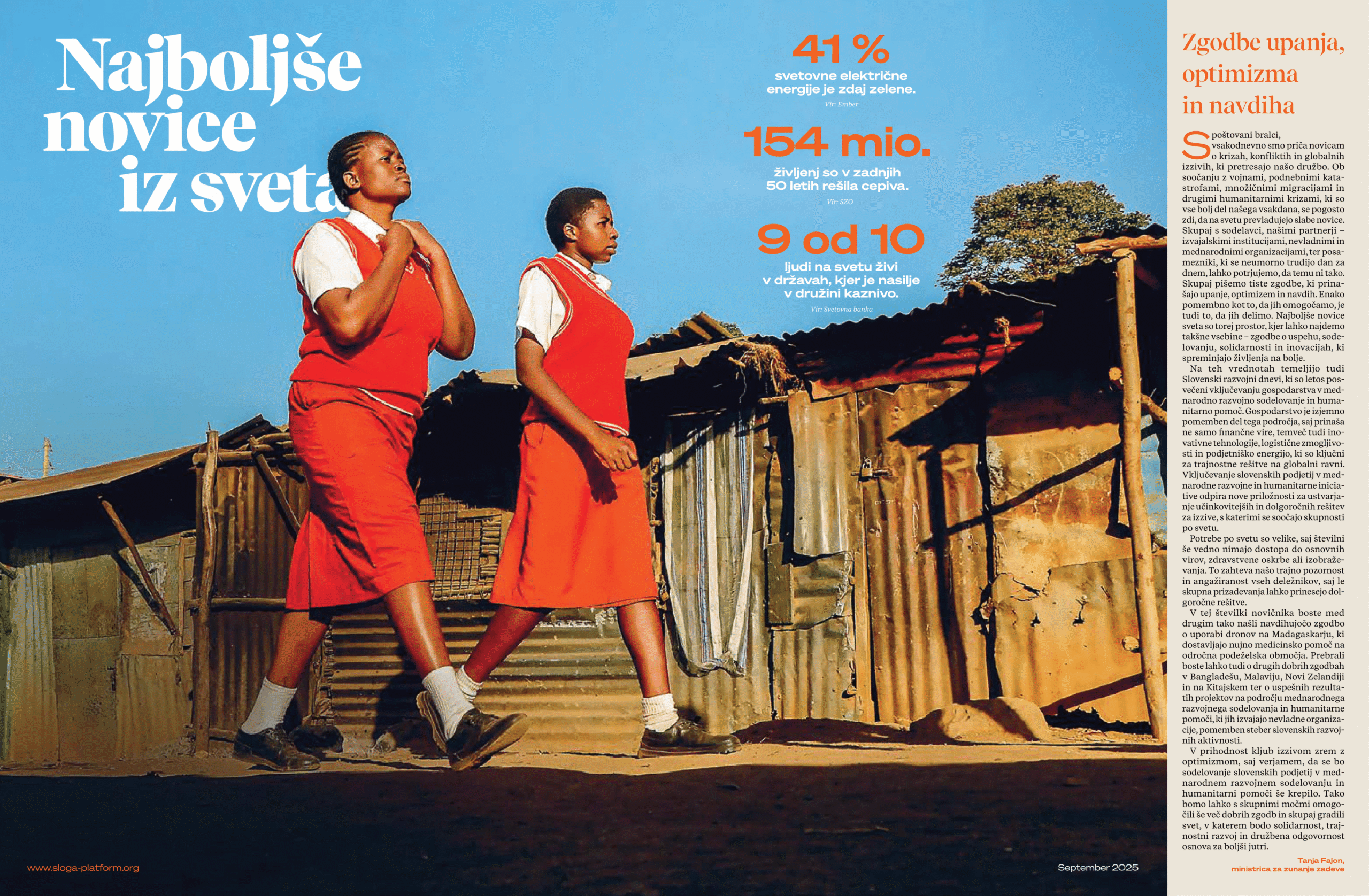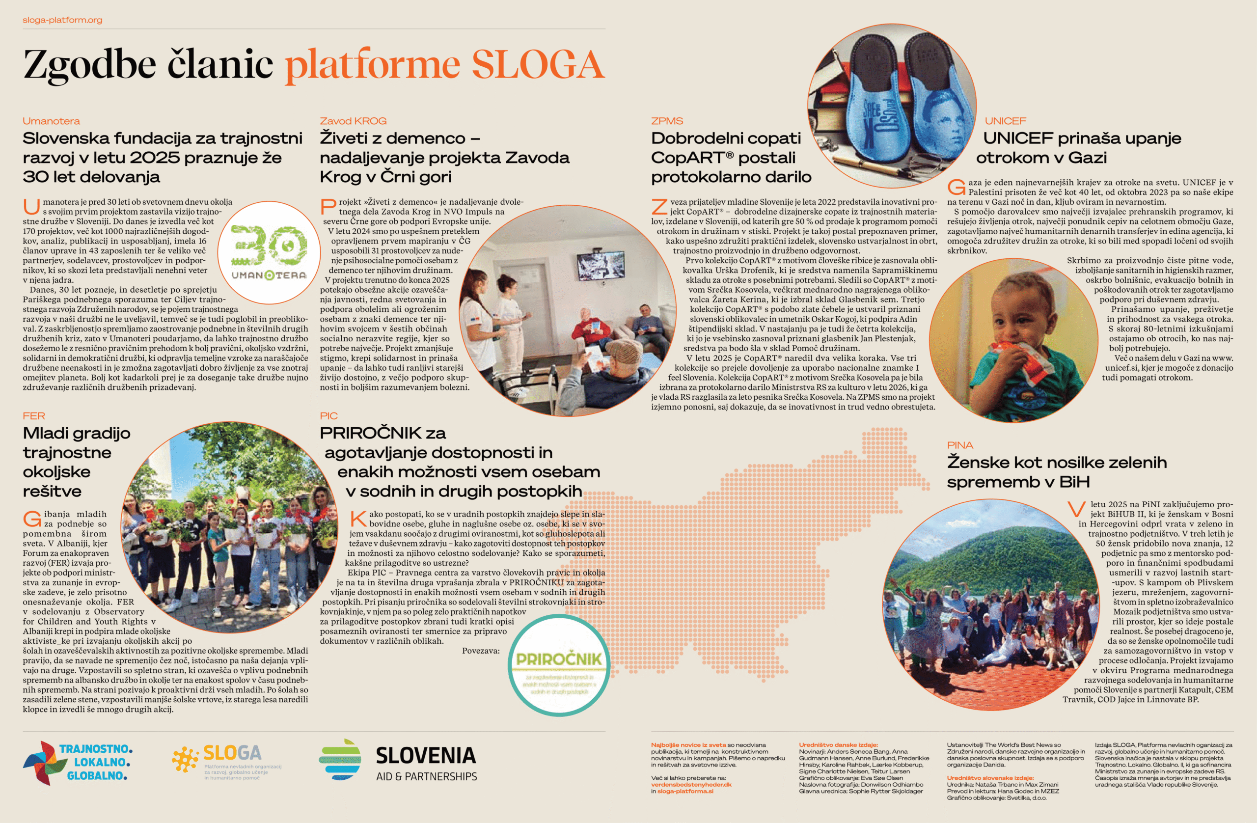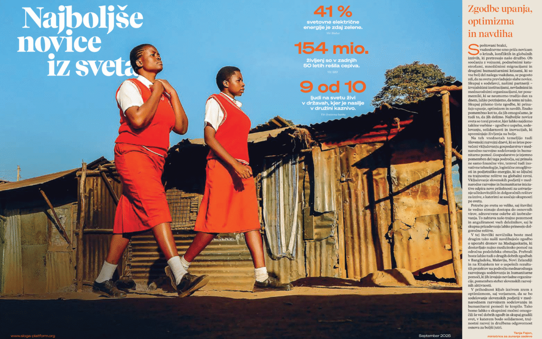 Platforma SLOGA je izdala novo digitalno številko časopisa Najboljše novice sveta, ki prinaša navdihujoče zgodbe o upanju, sodelovanju in trajnostnem razvoju . Publikacija, nastala v okviru projekta Trajnostno. Lokalno. Globalno. II, predstavlja pozitivne primere iz sveta in dosežke slovenskih nevladnih organizacij na področju globalnega učenja, humanitarne pomoči in razvojnega sodelovanja. Med zgodbami izstopajo droni, ki rešujejo življenja mater na Madagaskarju, ter projekti članic, kot so Umanotera, Zavod Krog, PiNA in ZPMS. Časopis izpostavlja pomen povezovanja gospodarstva, civilne družbe in mednarodnih partnerstev pri ustvarjanju pravičnejšega in trajnostnega sveta .